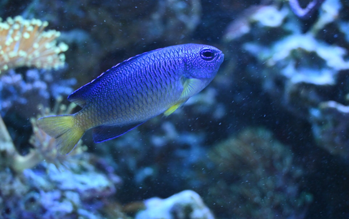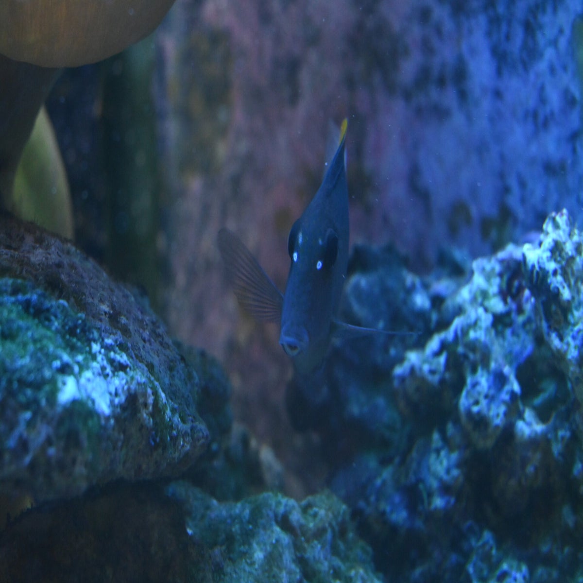 Hoewel deze felgekleurde rifvis klein is (meestal rond de 6 cm), staat hij bekend om zijn territoriale en soms agressieve gedrag, vooral tegenover soortgenoten of kleinere vissen. In het wild komt deze vis voor in de Indo-Pacifische regio, waar hij zich schuilhoudt tussen koraal en rotsformaties. Dit rifbewonertje voedt zich voornamelijk met plankton en kleine ongewervelden, net als de: "Pomacentrus Auriventris" In dit aquarium behoort hij tot de familie van de Juffers.